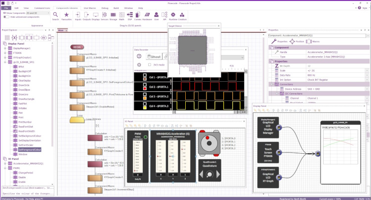 In the latest version of Flowcode, users can now welcome improved interface improvements including new toolbar and ribbon, state machine programming, the ability to create colour graphical displays with multiple images and text boxes for gLCD's, a new IOT component pack and microcontroller peripherals.