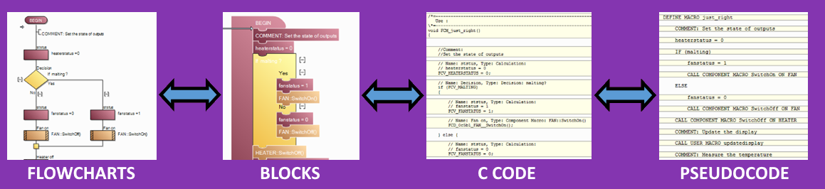 您可以在流程图、块、c代码和伪代码中编程,并在这些范式之间无缝传输。
