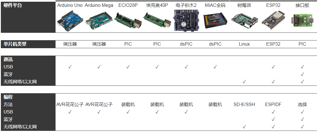 ATMEGA328P、Arduino Uno PDIP、Arduino Uno R3 PDIP、Arduino Uno R3 SMD、Arduino Uno SMD、Arduino LilyPad 328、MIAC(Arduino兼容)系统、MIAC(Arduino兼容)、16F1937、16F88、16F84A、16F877A、ECIO-28、ECIO-40、Formula Flowcode Buggy、Locktronics PIC、Matrix Project Board (18F24K50)、Matrix Proto Board (18F24K50)、MIAC System、MIAC V2、MIAC、Microchip Curiosity、Microchip MPLABXpress、Microchip PICkit 44Pin演示板、Microchip PICkit低引脚计数演示、30F3014、30F4013、EB091、ECIO40P16、公式Allcode、MIAC (dsPIC)系统、MIAC (dsPIC)、32MX320F128H、ChipKIT Uno32 PICKIT、ChipKIT WF32 PICKIT、ChipKIT uC32 PICKIT、AT91SAM7S128、EB031 , ECIOARM, BL0080, BL0011, 16F18877 , BL0032, BL0086, BL0055, BL0061, BL0036,游戏代码