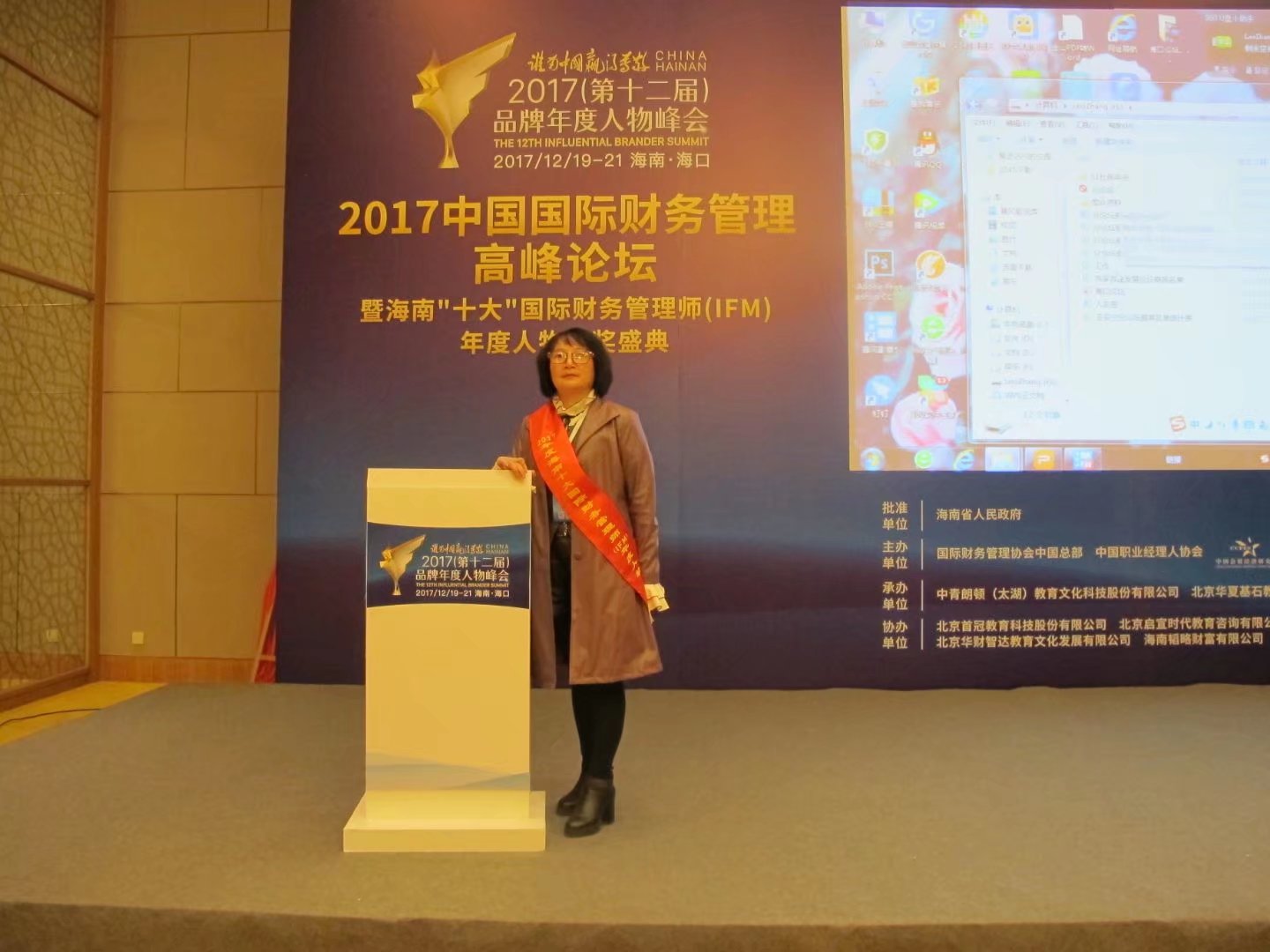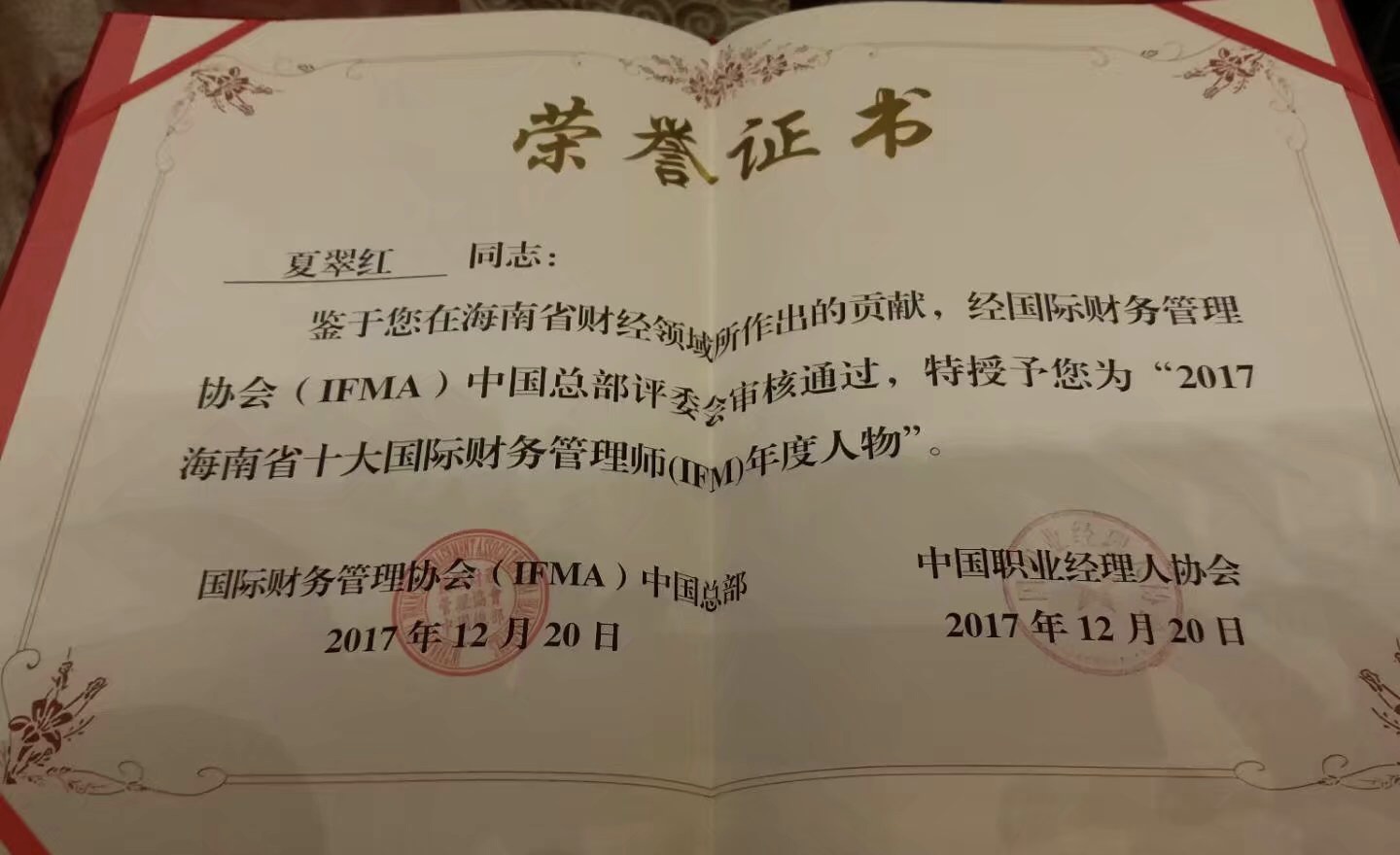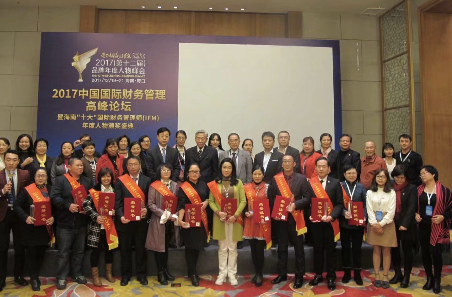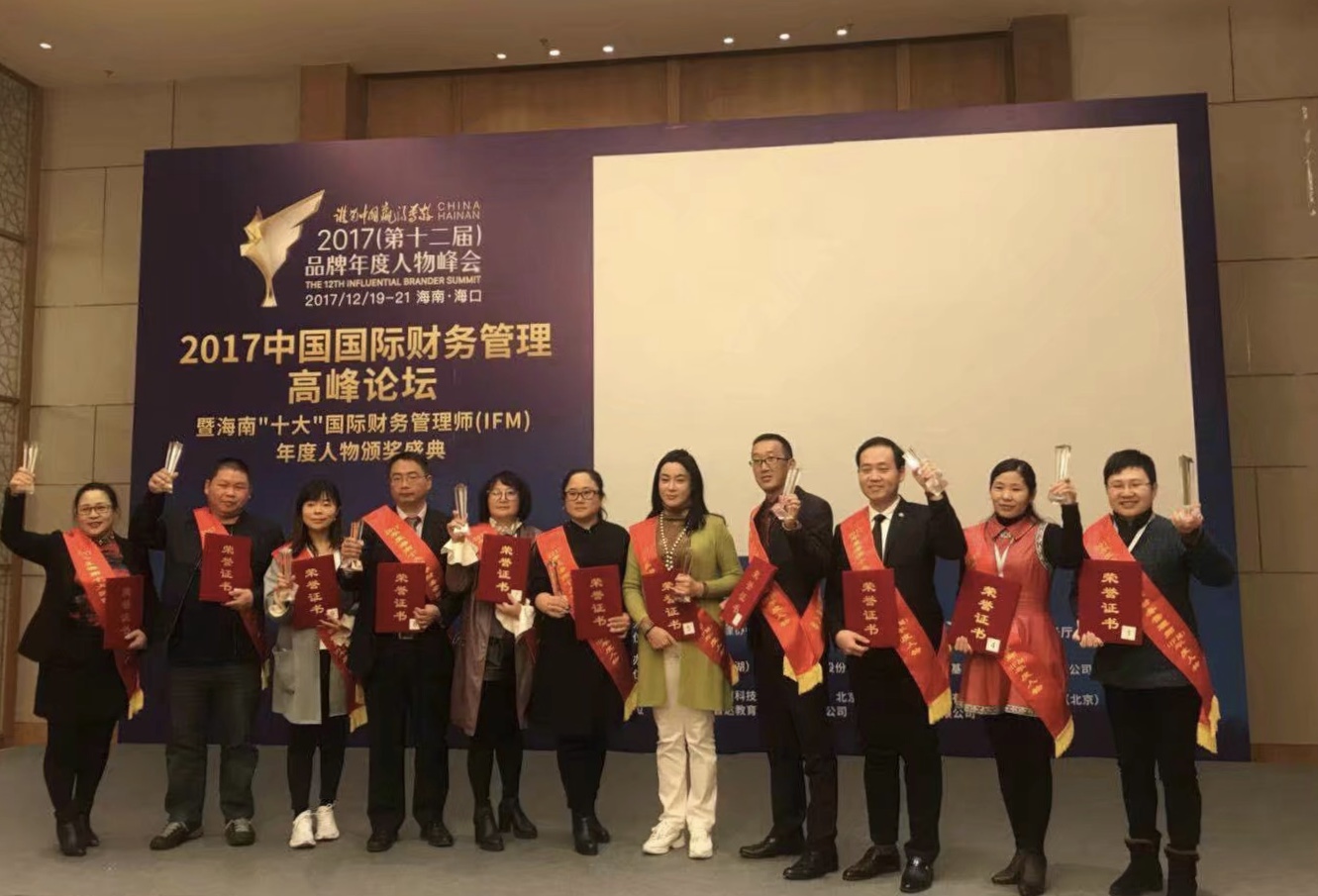 为发挥财务管理在经济转型升级过程中的重要作用,向社会展示财务精英服务经济社会发展的光辉业绩。12月20日,2017中国国际财务管理高峰论坛暨海南“十大”国际财务管理师(IFM)年度人物颁奖盛典在海南省海口市海南国际会议展览中心隆重举行。在本次大会中,公司董事长夏翠红获得2017年度“十大”优秀国际财务管理师称号。